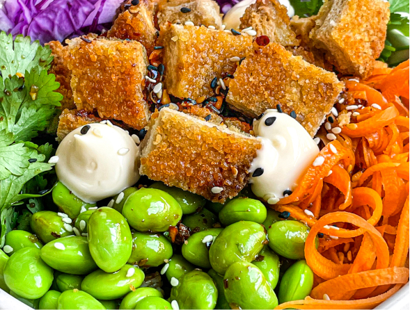 When ready to serve, assemble individual bowls with the rice, cabbage, carrots, edamame beans and coriander. Chop up the cooked schnitzels into bite sized pieces and assemble over the top. Pour asian chilli sauce over and give a good drizzle of your choice of mayonnaise. Enjoy!